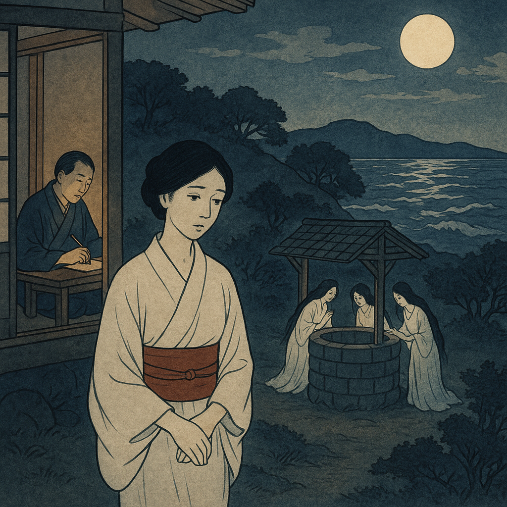 月明かりに照らされた庭の井戸のそばで、三人の女が井戸を覗いている姿が見えたのです。